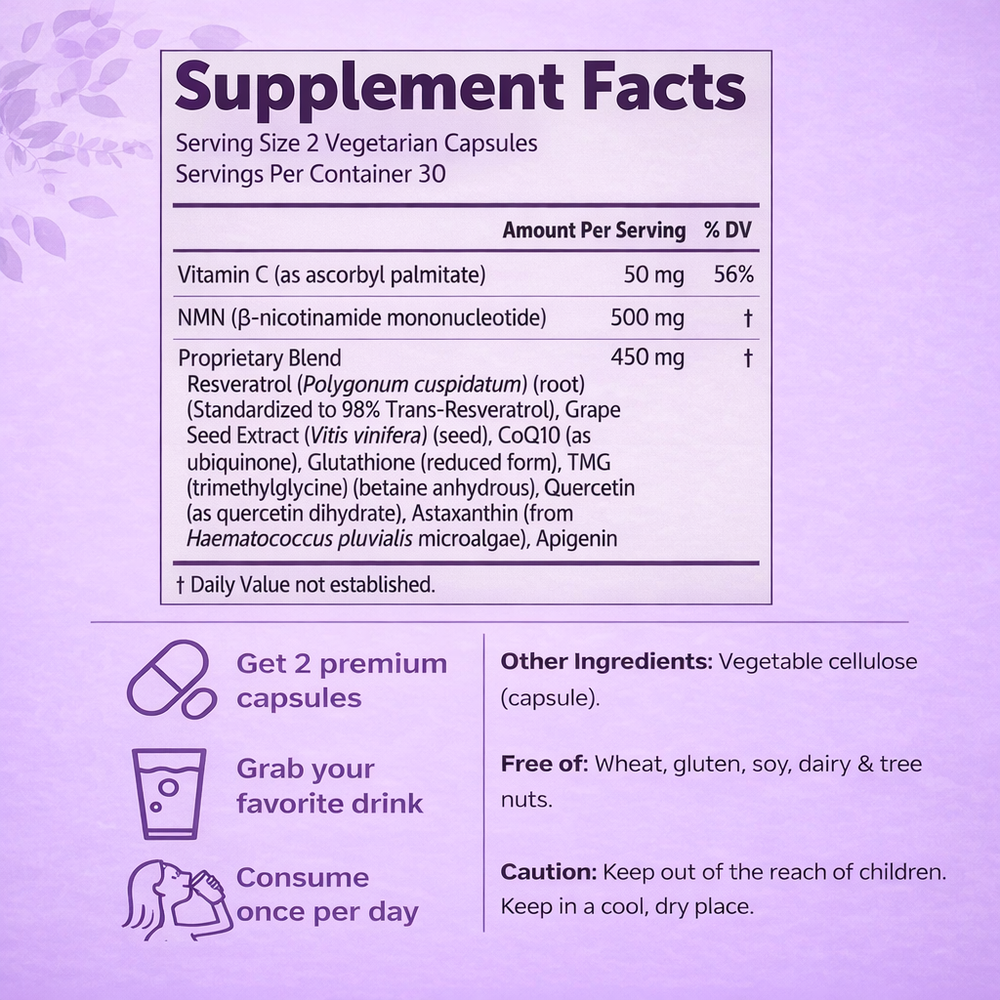 NMN raises NAD+, but the other 6 compounds make sure your body can actually use it. Resveratrol activates longevity pathways. TMG prevents methyl depletion. CoQ10 powers your mitochondria. Glutathione and Astaxanthin protect NAD+ from breaking down. Together, they amplify results you wouldn't get from NMN alone.